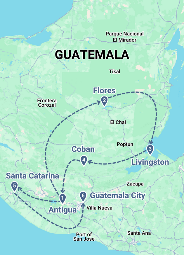• Cities: Guatemala, Antigua City, Flores, Livingstone